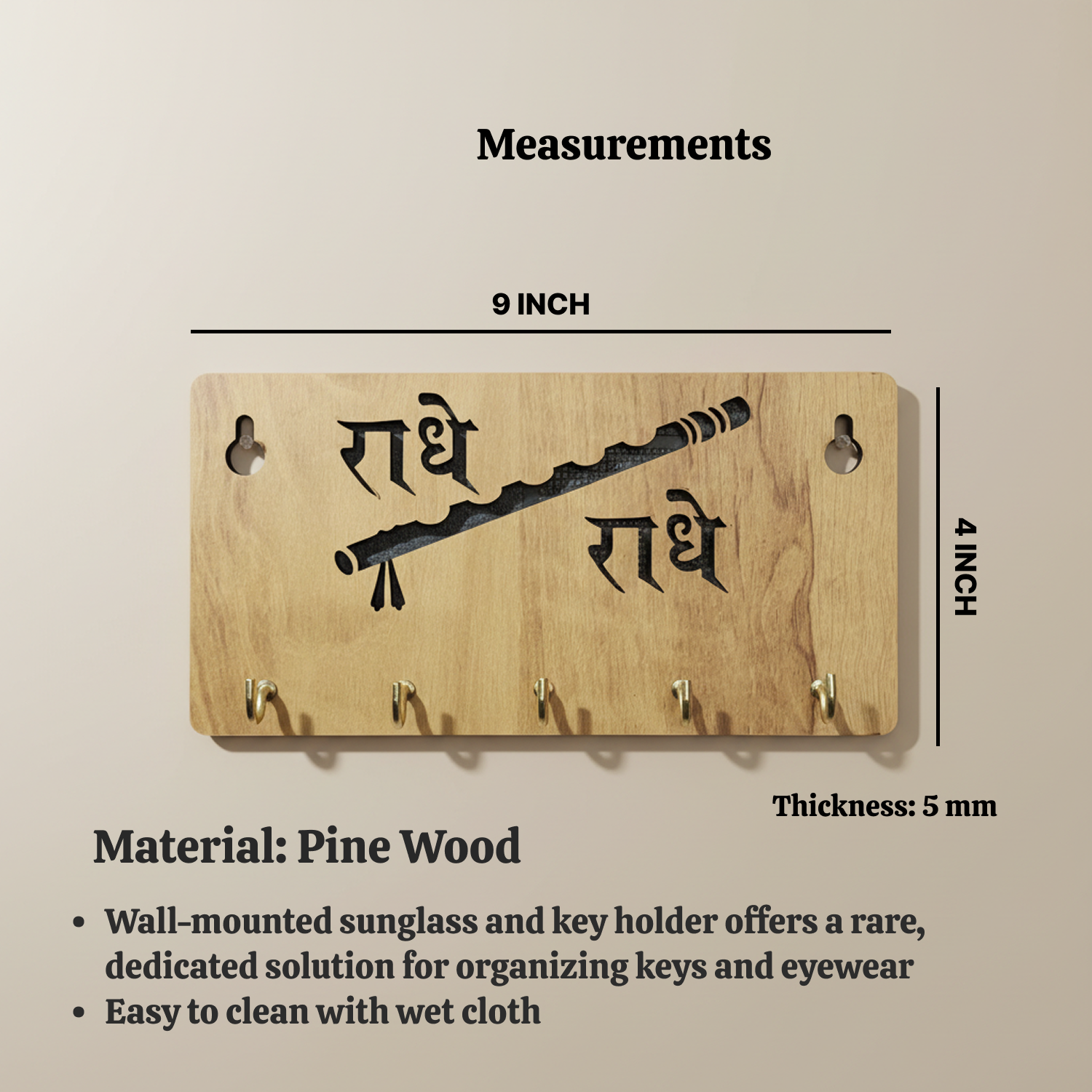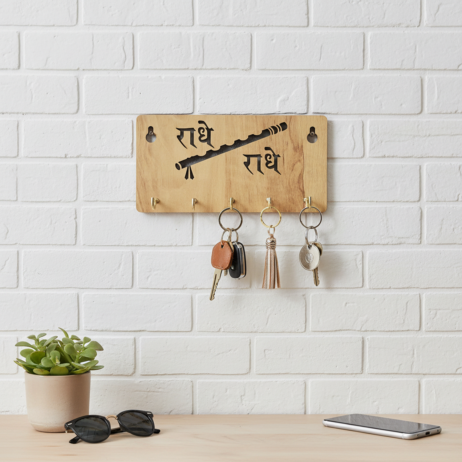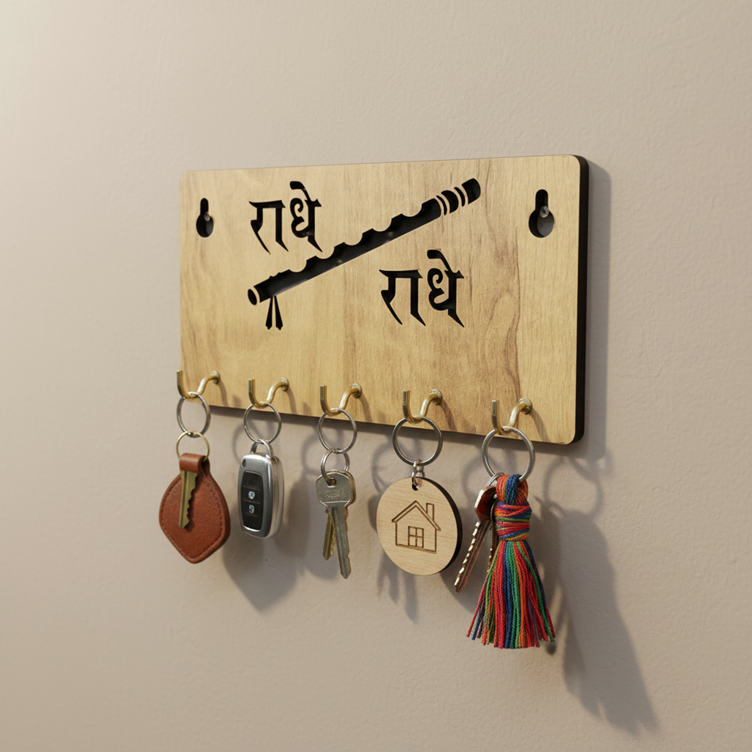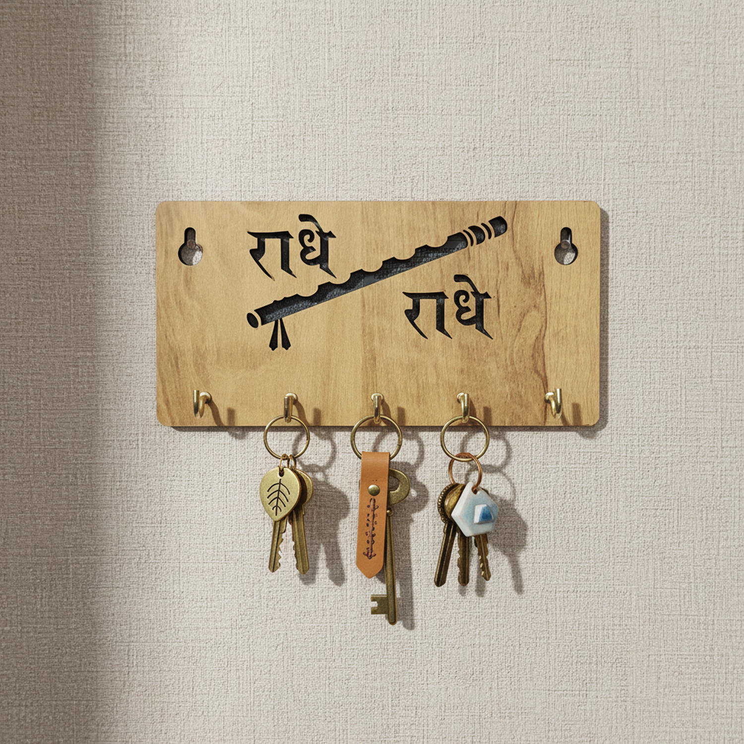 Infuse your home with devotion, calm, and graceful organization with this beautifully designed “राधे राधे” Wooden Key Holder for Wall. Inspired by Shri Radha-Krishna bhakti, this key holder features elegant Hindi typography paired with a flute (Bansuri) motif, symbolizing love, harmony, and divine connection.